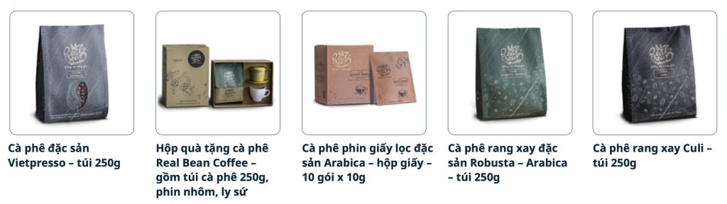 Thấu hiểu được cây cà phê là sinh kế của phần lớn người dân ở vùng Tây Nguyên Việt Nam, nhưng giá trị của cà phê Robusta chủ yếu được xuất khẩu thô và giá trị kinh tế thấp, công ty TNHH Real Bean Coffee ra đời với sứ mệnh đưa hương vị cà phê đặc sản đến với người tiêu dùng trong nước và quốc tế. Real Bean Coffee chú trọng từ khâu chọn thổ nhưỡng, ươm trồng, thu hái để cho ra thành phẩm hạt đạt đúng tiêu chuẩn chất lượng quốc tế. Real Bean Coffee rất vinh dự và tự hào khi nhận được Giải Bạc cuộc thi rang xay tại gốc AVPA Pháp 2021 và Giải Bạc thiết kế bao bì sáng tạo ASEAN – Hàn Quốc 2020. Những hình ảnh sản phẩm, feedback của khách hàng cũng như hoạt động của Real Bean Coffee thường xuyên được chia sẻ trên Trang Facebook của công ty để có thể tiếp cận tới các khách hàng hiệu quả hơn.